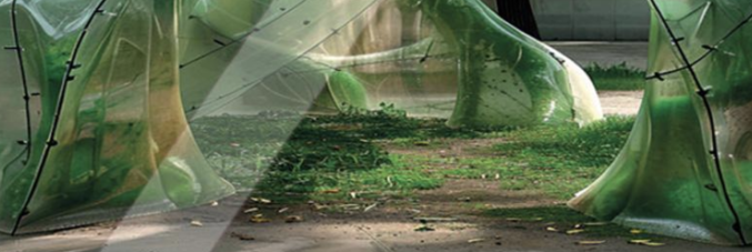 In Venice, this took the form of a small, experimental shelter with an ephemeral existence — an intuition of a prototype that appears as a footprint or screenshot of our decaying 'Pandora' situation: a soluble artefact made from spirulina algae and corn... (from NPK industrial polluting agriculture), where pectin, glucose and starch are extracted and metabolised for yarn and pellets by a knitting membrane using CNC computing. This membrane is kept in a state of disequilibrium by a fragile starch structure using robotic process.
