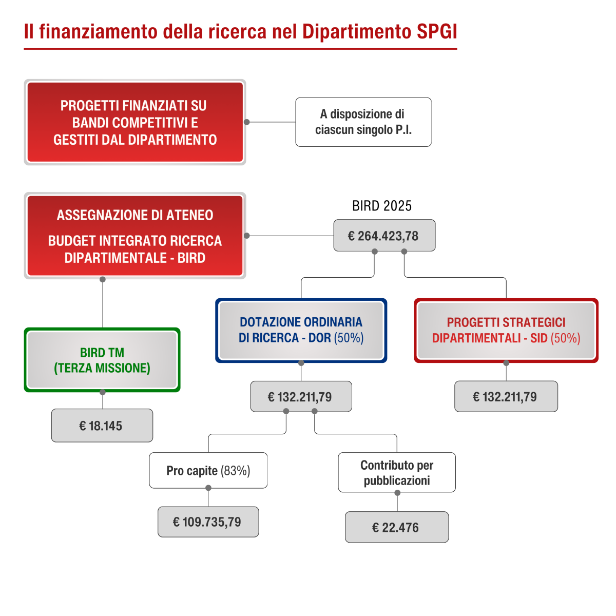 La ripartizione del Budget integrato per le attività di ricerca (BIRD) tra DOR (Dotazione Ordinaria Ricerca) e SID (Investimento Strategico Dipartimento) è approvata annualmente, su proposta della Commissione Ricerca, dal Consiglio di Dipartimento. In linea con i criteri generali dell’Atene, la dotazione ordinaria di risorse per la ricerca è assicurata a tutti i settori e le aree disciplinari espresse al suo interno, sulla base di criteri legati alla quantità e qualità della produzione scientifica e distribuisce risorse per la ricerca ulteriori sulla base di bandi competitivi interni.