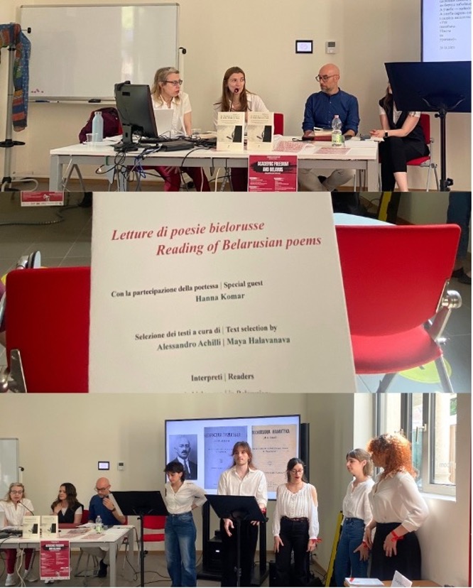 The day concluded with a powerful literary session, Il mondo è finito. Noi invece no, a presentation of a new anthology of contemporary Belarusian poetry. Translators Alessandro Achilli and Maya Halavanava introduced the collection, with poet Hanna Komar joining for a live reading. Students from the DISLL department also participated, giving voice to poems that speak of loss, resilience, memory, and resistance. The closing session left a lasting emotional impression, which reminded everyone that poetry, like protest, can carry both grief and hope.